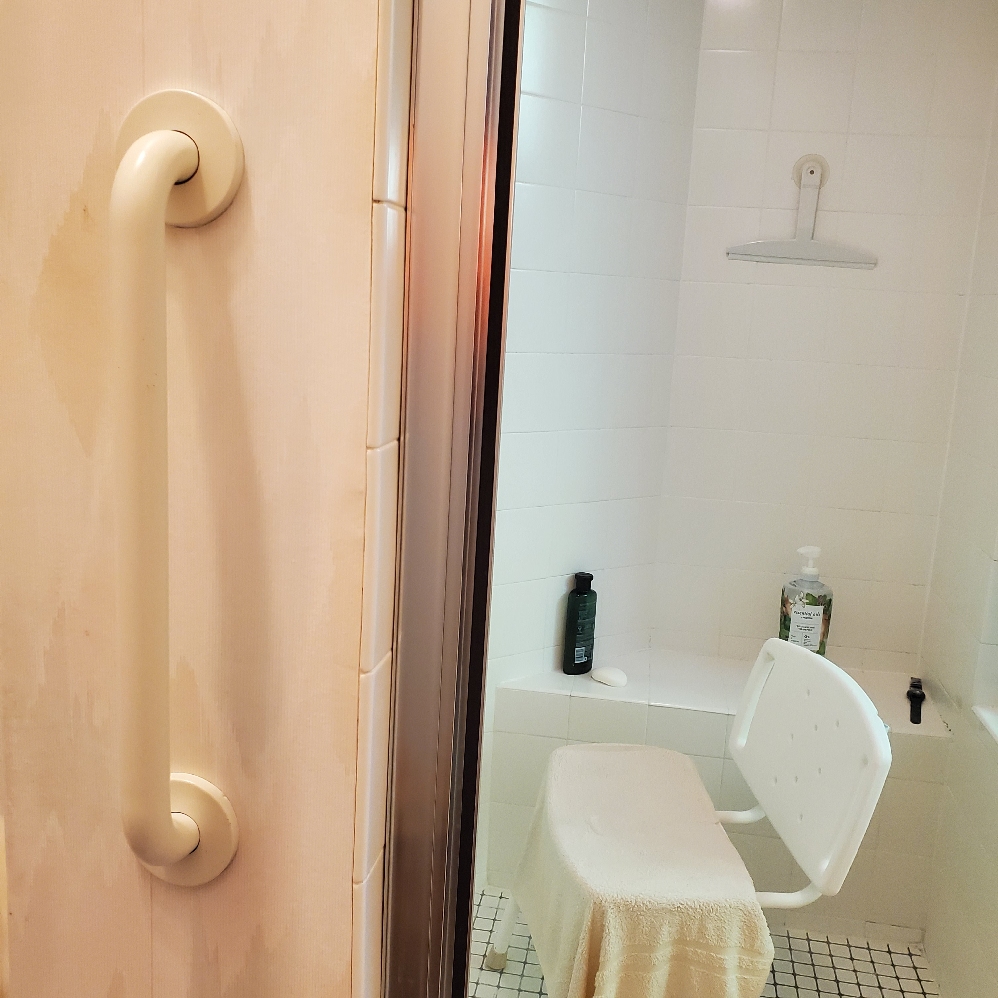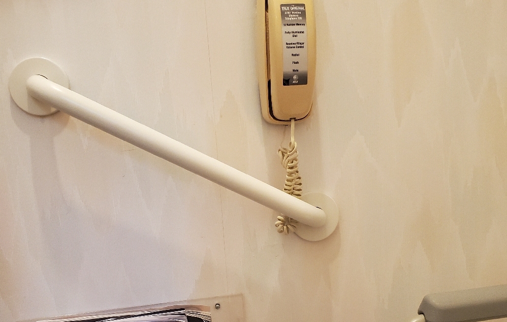 Here is an angled grab bar next to a potty.