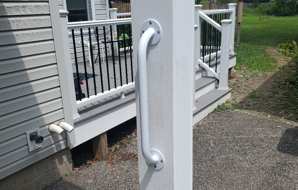 One client asked for a grab bar to help step up to an outside stoop. This is a white, powder-coated bar that is fastened to the post with stainless steel construction screws.