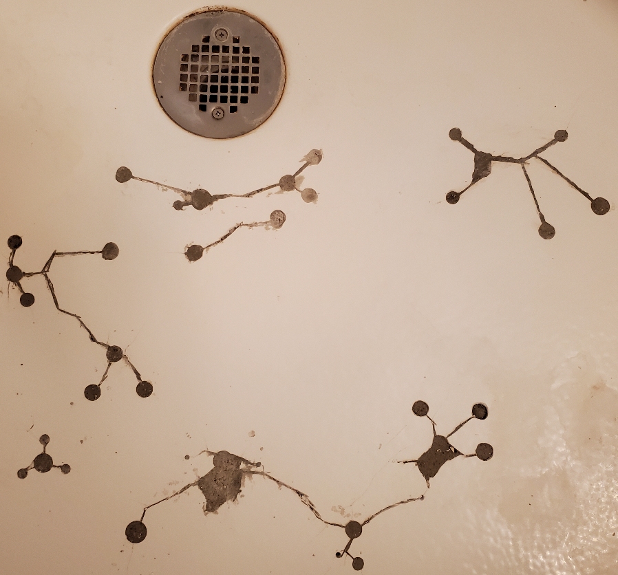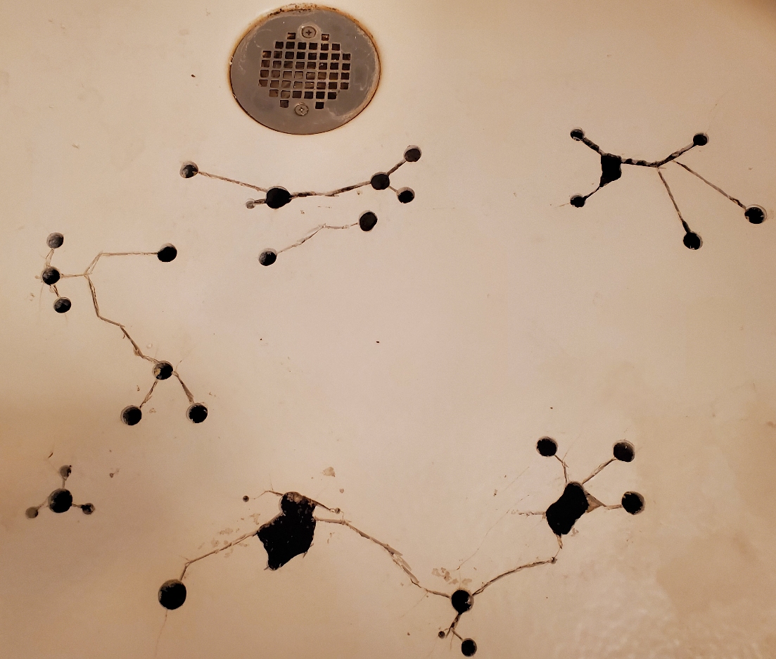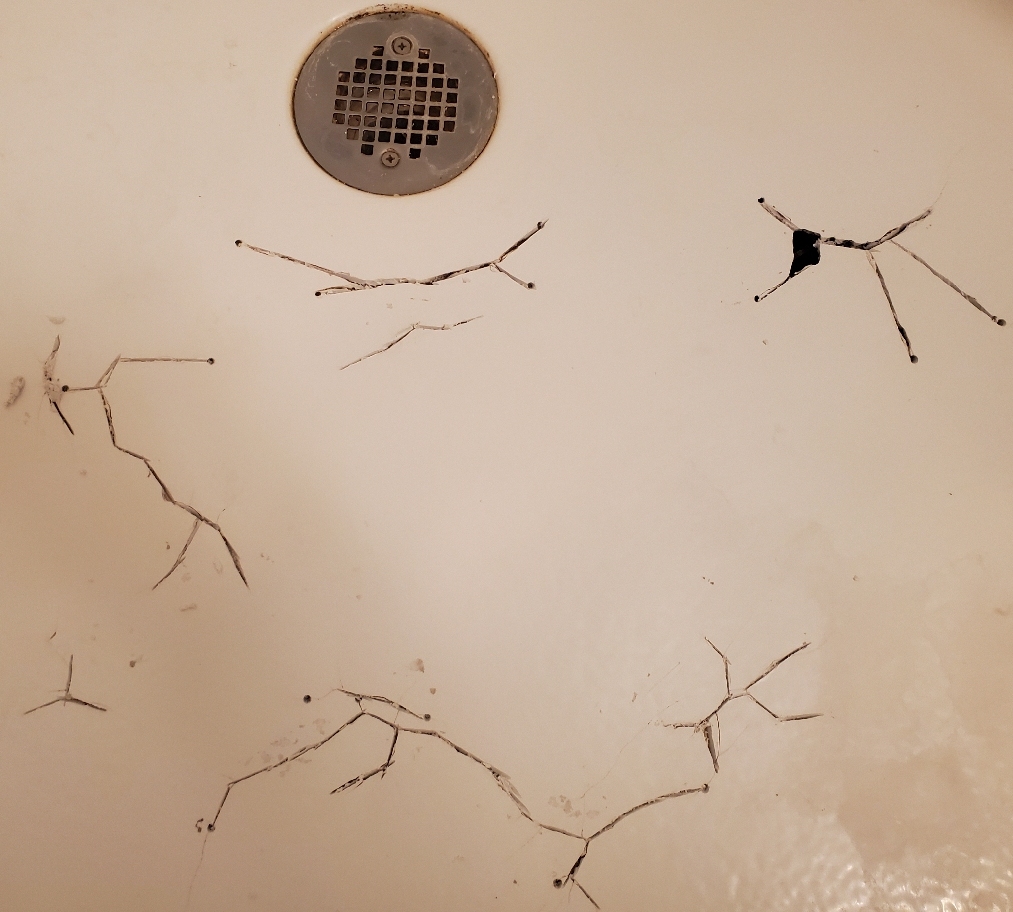 A client had a built-in shower with an acrylic pan. The pan had cracked in several locations, as shown below. This photo shows the cracks after they had been enlarged with a small abrasive cutting wheel.