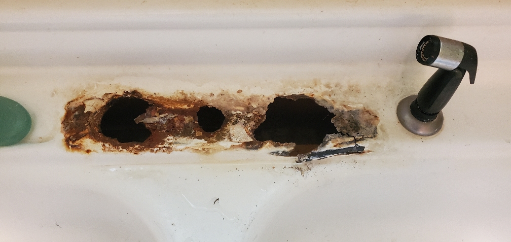 The damage was significant. The first step was to cut a 1/8" thick aluminum backing plate for the depth of the backsplash and the width of the damage and drill a hole pattern for the faucet the client selected. This plate mounted beneath the surface of the sink and formed the foundation to which the faucet will eventually be secured.